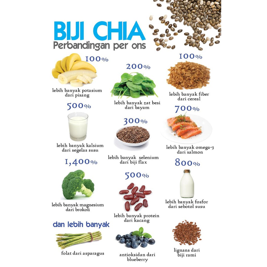 Beli biji chia online berkualitas dengan harga murah terbaru 2020 di tokopedia. Chia seed cukup banyak menjadi bahan perbincangan di kalangan pecinta makanan organik. Rasa yang ringan dari chiaseed merupakan campuran makanan yang lezat. Chia seed merupakan biji chia yang dilengkapi dengan asam lemak esensial omega 3 sebagai salah satu sumber nabati terkaya.